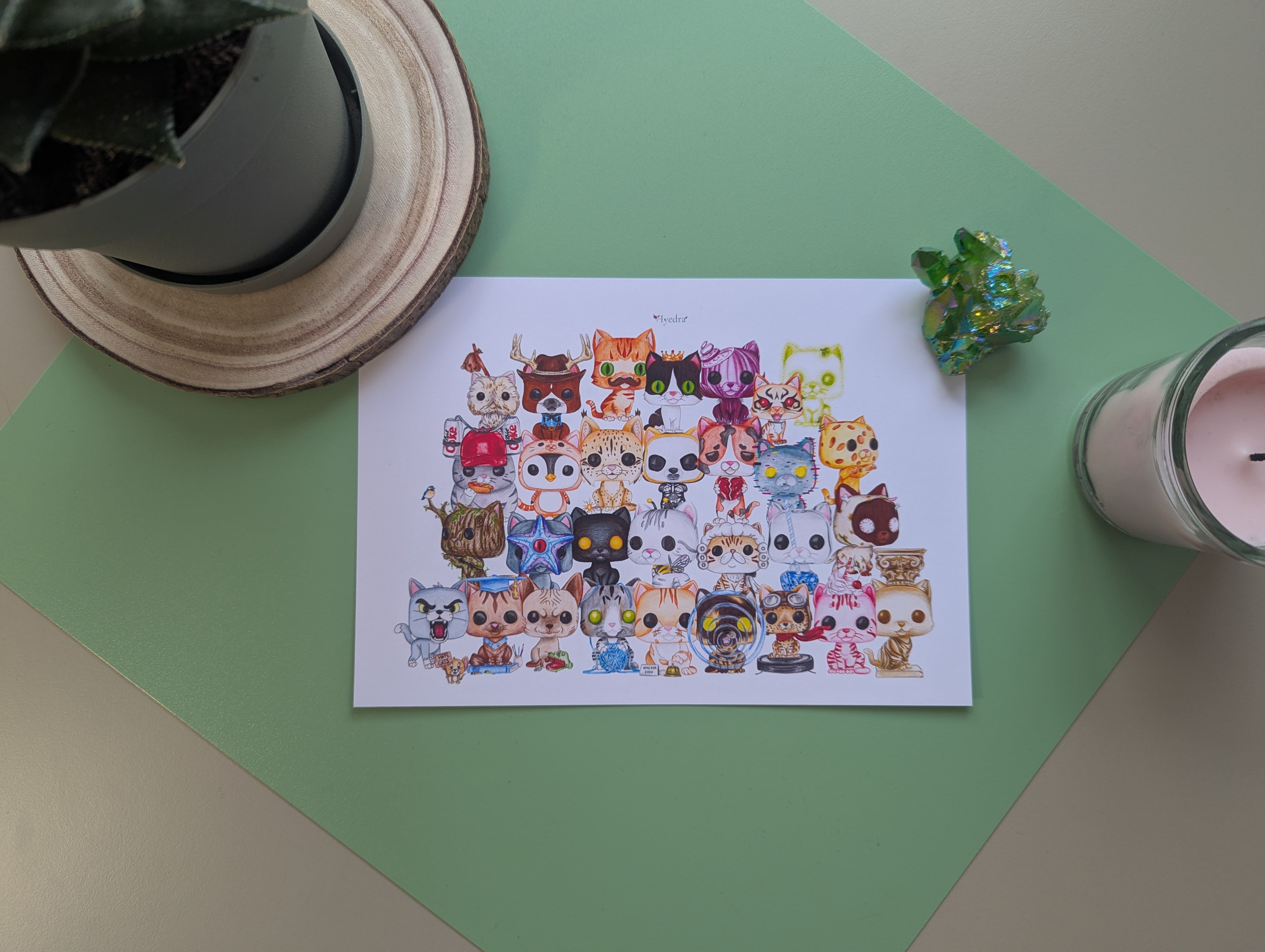 Esta lámina es un must-have para coleccionistas, amantes de los gatos, y cualquiera que disfrute del arte original que combina ternura y referencias culturales. ¡Es el centro de atención perfecto para cualquier espacio!